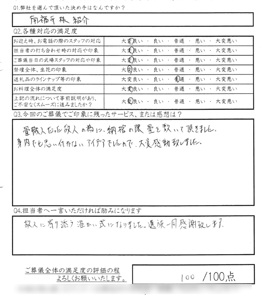 身内でも思い付けないアイデアで納棺していただいて大変感動いたしました
