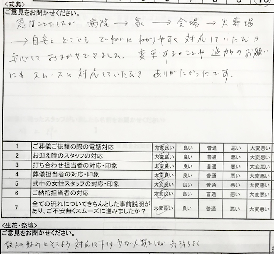 急なことでしたが、病院→家→会場→火葬場→自宅とどこでも丁寧にわかりやすく対応していただき、安心しておまかせできました。
