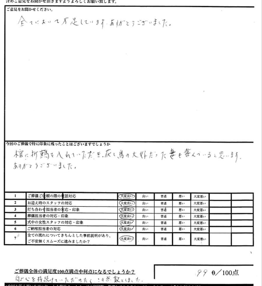- 以前にお父様、お母さまのご葬儀でご縁を頂き、この度は奥様のお見送りお手伝いさせて頂く事になりました。