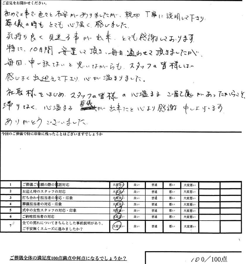 特に10日間安置して頂き、毎日通わせて頂きましたが、毎回申し訳ないと思いながらも、スタッフの皆様は感じよく出迎えて下さり心温まりました。